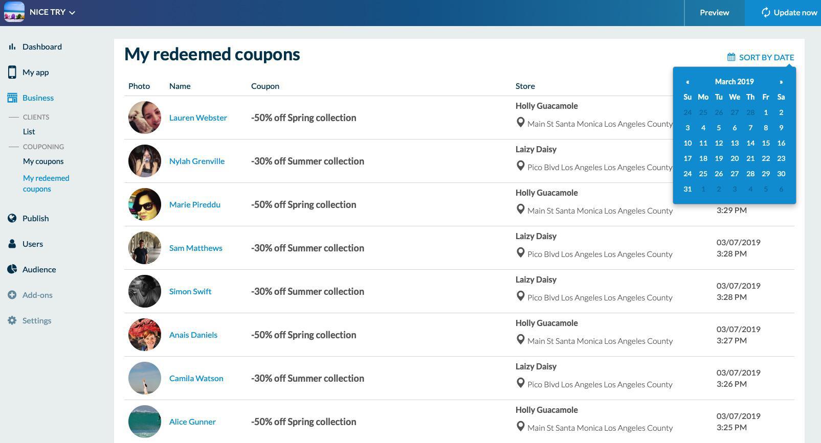 On the Business > Couponing > My Coupons page, until today you could sort your coupons based on their validity and expiration dates. From now on you can also sort them by:
