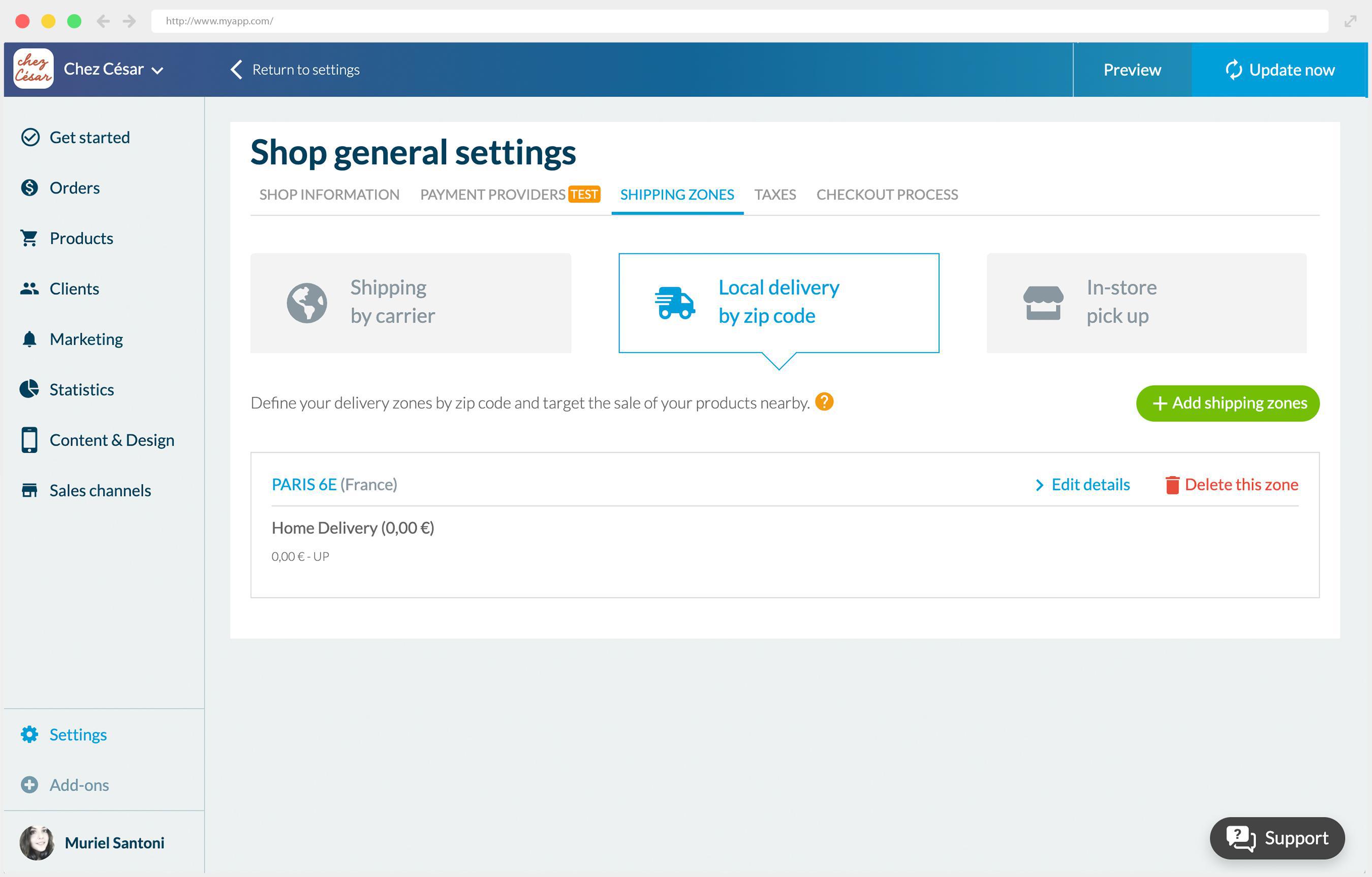 In the context of a local grocery store, offering local delivery was an obvious choice. The manager of Chez César preferred to limit his delivery service to a single Parisian district, in order to be able to ensure quality service to his loyal clientele and not have to waste too much time on delivery. Local delivery has consequently been set up in the app, allowing him to offer a safe and fast service to his clients. With this local delivery service covering the area around the grocery shop, customers in the 6th arrondissement of Paris will be able to select their items quickly thanks to the quick buy button,  pay for their groceries online, and then have them delivered to their homes during the time slot of their choice.
