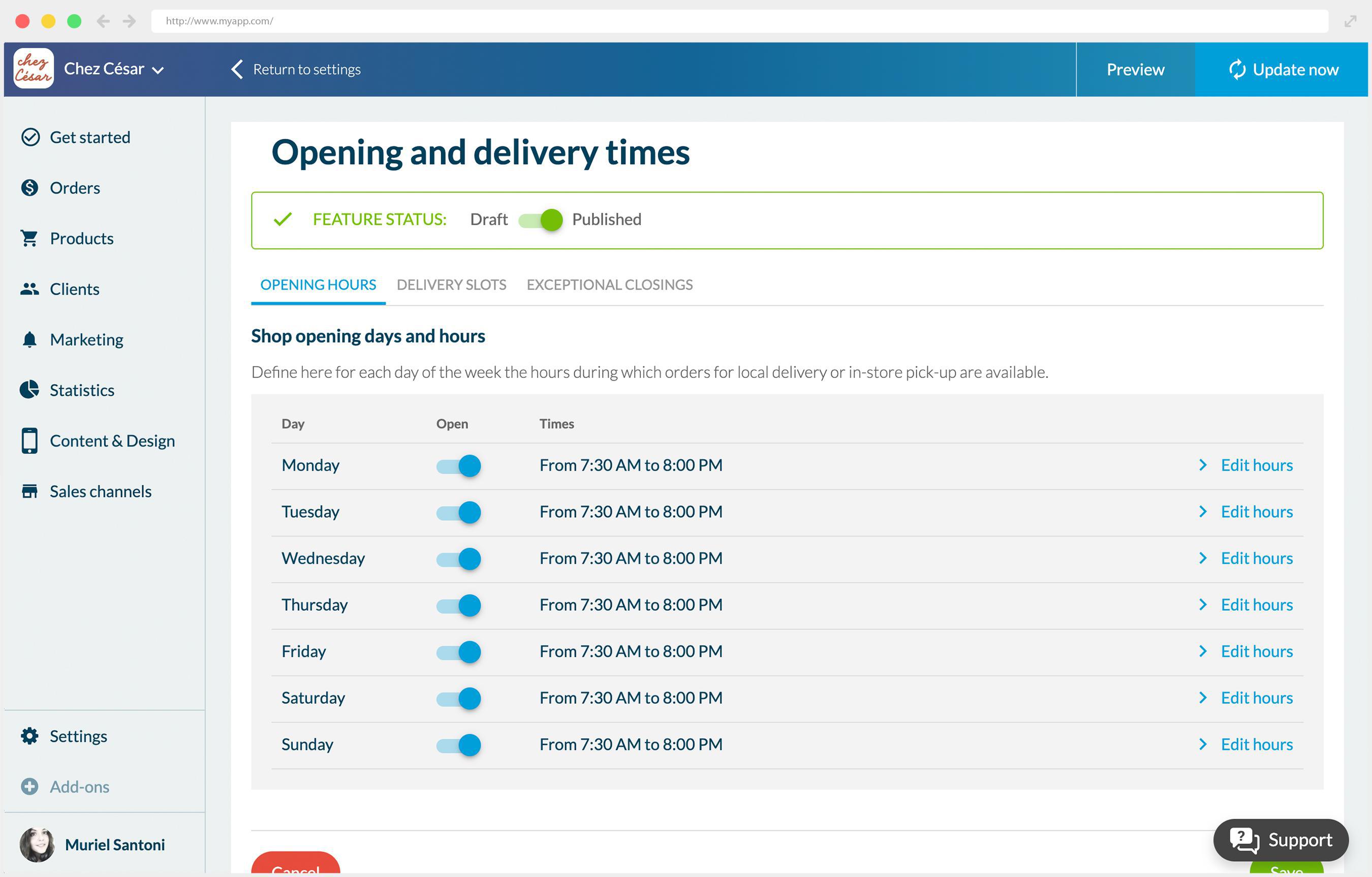 To better organize himself and offer even more convenience to his clients, Chez César's manager decided to activate the Time Slots feature. It allows him to define slots during which customers can choose the time at which they wish to be delivered or pick up their groceries.