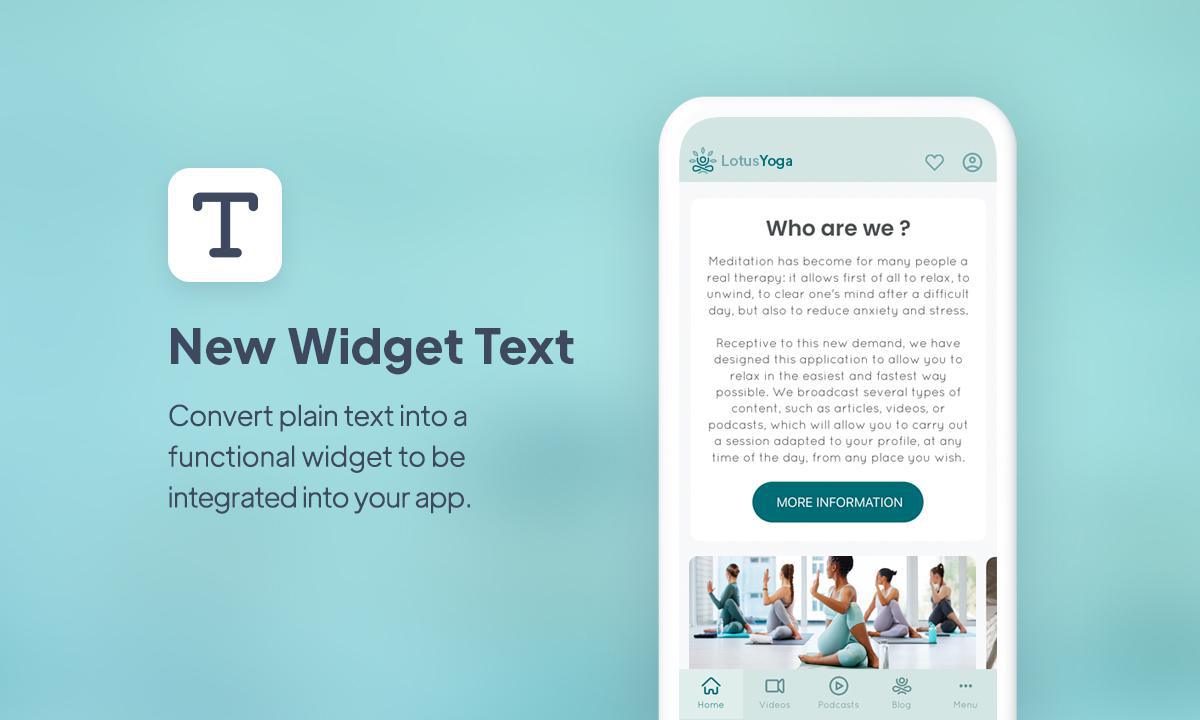 Available for eCommerce and content apps, it allows you to add text freely to the homepage of your application. It may seem simple, but do not underestimate the potential of this widget, which can have a myriad of uses! Whether it's for introducing yourself, presenting a section of your app, providing instructions, or simply for aesthetic reasons, it will serve you well.