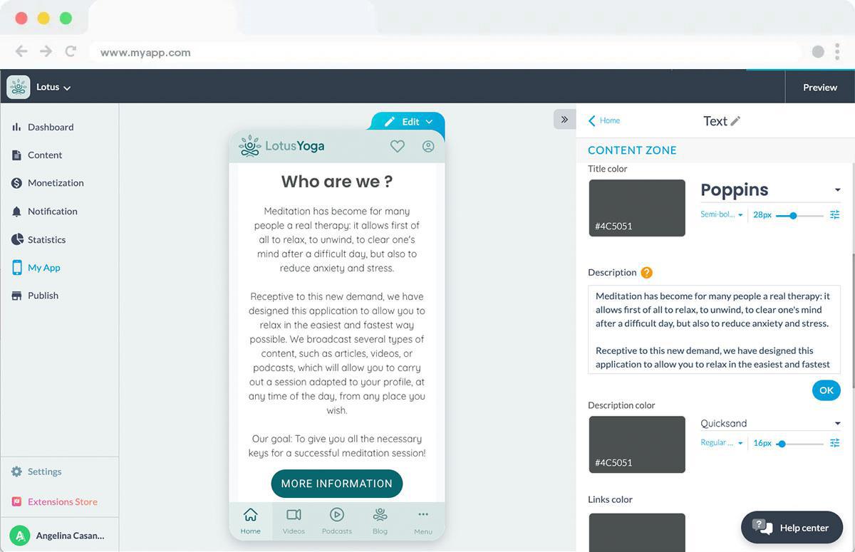 To add a Text widget, go to your back office, menu My App > Structure > Home. Then, add a new widget and choose the Text widget. Now, all you have to do is configure your widget and insert your text. Your widget is ready!